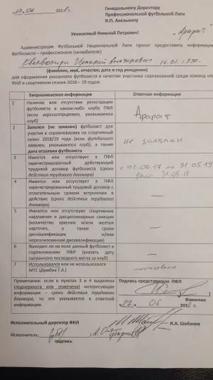 В распоряжении Sport24 также есть документ, содержащий информацию о внесении футболиста Ираклия Квеквескири в заявку на сезон ФНЛ. Как следует из п. 5 заявочного листа, руководство ФНЛ не обнаружило у футболиста спортивных нарушений и дисциплинарных санкций, поэтому он имел право находиться на поле в игре с «Армавиром» в матче первого тура ФНЛ.
