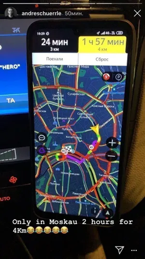 «Только в Москве: два часа на четыре километра 😂😂😂😂😂», — подписал Шюррле размещенный в инстаграме снимок, на котором видно, что навигатор показывает пробки в 9 баллов и предлагает маршрут, по которому автомобиль за 1 час 57 минут преодолеет 4 километра пути.