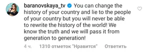 «Вы можете менять историю своей страны и врать людям своей страны, но вам никогда не удастся переписать историю мира! Мы знаем правду и будем передавать ее из поколения в поколение!» — написала Барановская. Ее комментарий собрал за 4 часа более 1,3 тыс. отметок «Нравится».