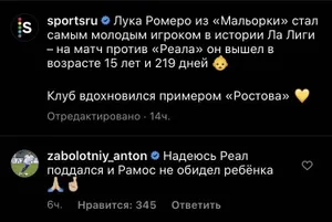 «Надеюсь, «Реал» поддался и Рамос не обидел ребенка», — написал Заболотный в комментариях в инстаграме под фото в инстаграме сайта Sports.ru.
