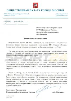 Учитывая отсутствие ущерба кому-либо, мы обращаемся к правоохранительным органам с просьбой воздержаться от уголовного преследования болельщиков за подобное выражение поддержки своего клуба», — говорится в письме, подписанном заместителем председателя Общественной палаты Москвы Алексеем Венедиктовым и адресованном начальнику ГУ МВД России по г. Москве Олегу Баранову.