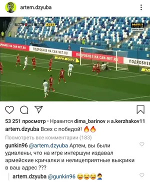 «Артем, вы были удивлены, что на игре интершум издавал армейские кричалки и нелицеприятные выкрики в ваш адрес?» — спросил у Дзюбы в инстаграме один из его подписчиков.