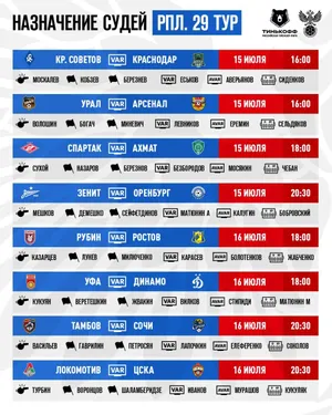 «Урал» — «Арсенал»: судья — Николай Волошин; ассистенты судьи — Николай Богач, Владимир Миневич; резервный судья — Владимир Сельдяков; VAR — Кирилл Левников; AVAR — Николай Еремин; инспектор — Тарас Безубяк.