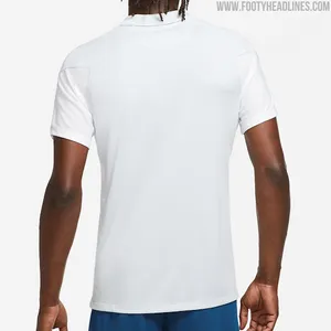 Выездная футболка выполнена в белом цвете, а нанесенные на нее логотипы — в голубом.