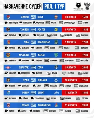 Пресс-служба Российского футбольного союза (РФС) объявила судей, которые обслужат матчи стартового, 1-го, тура РПЛ в сезоне-2020/21.