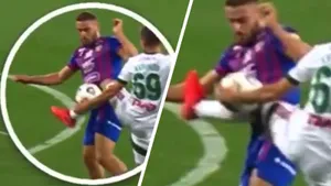 Далее данный игрок теряет равновесие и координацию движений, что происходит по двум причинам: его изначальная попытка подстроиться под мяч и нанести удар по нему ногой, а также действия игрока атакующей команды № 8 Николы Влашича, который своим левым бедром и стопой подбивает опорную ногу защитника, разворачивая тем самым его тело.