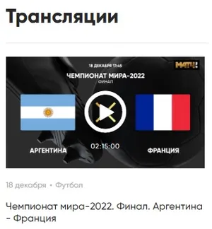 Где смотреть онлайн финал ЧМ-2022 по футболу Аргентина — Франция: на официальном сайте телеканала «Матч ТВ» по этой ссылке.