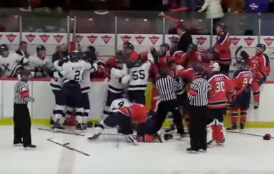 Дикое побоище в матче студенческих команд Канады. Игроки озверели, драться пришлось даже тренерам