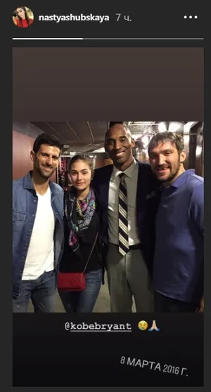 На фото, которое датировано 8 марта 2016 года, запечатлены Овечкины, Брайант и теннисист Новак Джокович. Анастасия сопроводила фотографию грустными эмодзи.