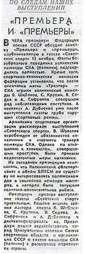 «После тревожных сигналов из Челябинска спортивно-техническая комиссия Федерации хоккея СССР подробно разобралась с положением, сложившимся в команде СКА. Недостойное поведение калининских хоккеистов не является случайностью. Это результат наплевательского отношения руководства и тренеров команды к воспитанию молодежи. Ведь со спортсменами, по существу, не велось никакой политико-воспитательной работы. Встречались они лишь на тренировках да на играх. В команде не существовало комсомольской организации. Федерация хоккея СССР дисквалифицировала хоккеистов А. Дубовского, С. Крупина, А. Софронова, В. Седова, В. Шибанова и лишила их звания мастеров спорта. Центральный совет Союза спортивных обществ и организаций СССР по предложению федерации решил снять команду СКА (Калинин) с розыгрыша первенства страны. Результаты ее игр аннулированы».