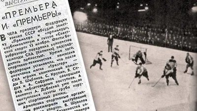 «Минувшим воскресеньем на челябинском льду впервые в этом сезоне состоялась встреча на первенство страны по хоккею. «Трактор» принимал армейцев Калинина. Счет ничейный — 1:1.