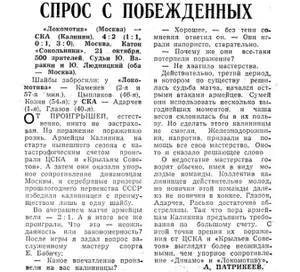 «О недостатке мастерства говорят обычно, имея в виду молодые команды. Коллектив калининцев действительно молод, но новички этой команды далеко не новички в хоккее. Глазов, Адарчев, Расько достаточно обстреляны. Так что пора армейцам Калинина предъявить требования по большому счету. С этой точки зрения их поражения от ЦСКА и «Крыльев Советов» выглядят более неожиданными, чем упорное сопротивление «Динамо» и «Локомотиву».