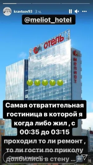 «Самая отвратительная гостинца, в которой я когда-либо жил. С 0:35 до 03:15 проходил то ли ремонт, то ли гости по приколу долбились в стену. Я позвонил и попросил разобраться в данной ситуации. Через час позвонил обратно на ресепшн, на что я услышал, что все в порядке, а это мои проблемы. Я не завидую ребятам из хоккейных команд, которые останавливаются в этой гостинице. Так как эти проблемы происходят постоянно, многие на них жалуются, будьте внимательны при выборе гостинице в городе Челябинск. Спасибо вам еще раз», — написал Кравцов.