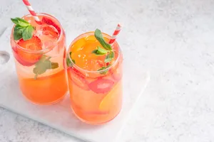 - Туда же добавьте получившийся сахарный сироп, газированную воду, клубнику, нарезанную дольками, листья мяты и лед.