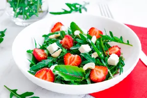 - Рукколу промойте и высушите. Выложите в глубокое блюдо.