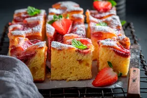 - Форму для выпечки смажьте маслом и присыпьте мукой. На дно выложите промытую, обсушенную клубнику.