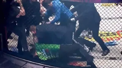 Однако после боя в клетке возникала потасовка. Причина конфликта неизвестна. Разнимать бойцов ринулись чуть ли не все, кто был в клетке.