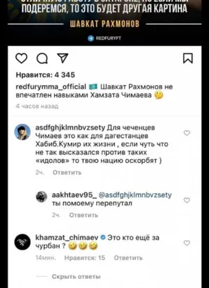 «Это кто еще за чурбан?», — написал Чимаев в соцсетях под публикацией с цитатой Рахмонова, но позднее удалил свой комментарий.