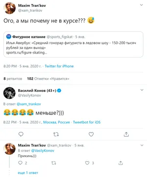 Все началось с того, что в интервью Sport24 хореограф Илья Авербух рассказал о среднем заработке фигуристов в его шоу: «Средний гонорар спортсмена где-то 150-200 тыс. рублей за один выход». Это очень удивило жену Евгения Плющенко Яну Рудковскую и двукратного олимпийского чемпиона Максима Транькова. Но если Траньков удивился в духе «почему так много»…