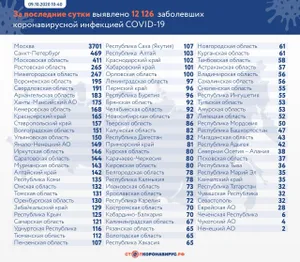 За последние сутки в России выявлено 12 126 новых случаев коронавируса в 85 регионах. Из них 27% не имели клинических проявлений болезни. Зафиксирован 201 летальный исход. За сутки в России полностью выздоровело 7092 человека.