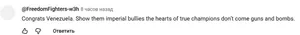 — Поздравляю Венесуэлу. Покажите этим имперским хулиганам, что сердца настоящих чемпионов не забиты оружием и бомбами.