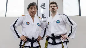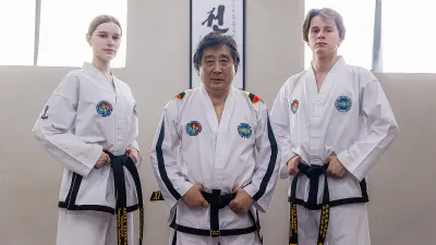«Это уже мое девятое поколение учеников», — показывает профессор Кан на детей с разными поясами, один из которых (с черным) — его внук.