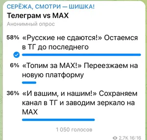 За сутки с небольшим в нашем опросе Telegram vs MAX приняли участие 1050 человек.